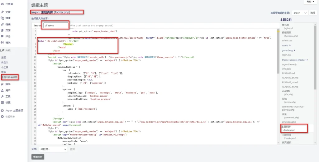 我们可以在主题文件编辑器里编辑footer.php文件: